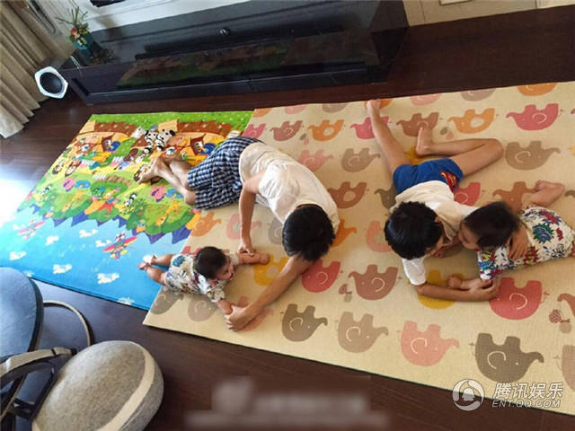照片中,林志颖和儿子们一起躺在地板上玩耍。