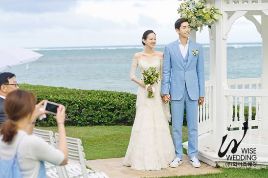 申成禄的浅蓝色西装高挑帅气,新娘的一席洁白婚纱温婉动人,加上夏威夷的海边美景映衬,画面浪漫至极。