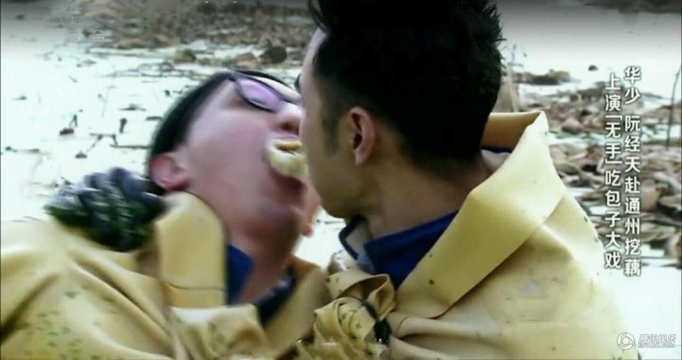 《了不起的挑战》阮经天、华少泥塘挖藕挖出基情,两人频频曝出“污”段子不说,阮经天还强吻华少嘴中包子啊!阮经天羞涩说道:你咬到我嘴唇了!无节操画面太美,连旁边的池塘老板都脸红不已!好污!