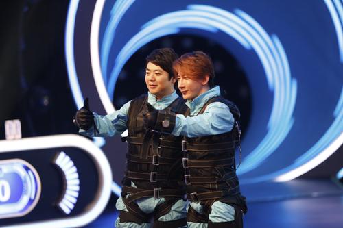 2.体验高空秋千时,郎朗与搭档郭蕾显得既紧张又兴奋。两人不停的相互鼓励,还时不时的向对手刘谦和他的搭档陶然“放狠话”,“呆萌”气质尽显。