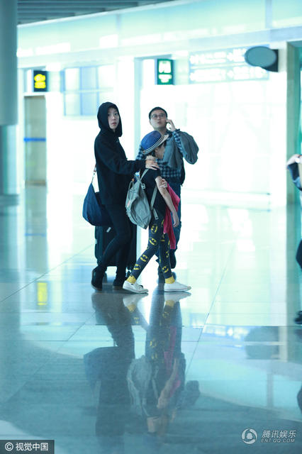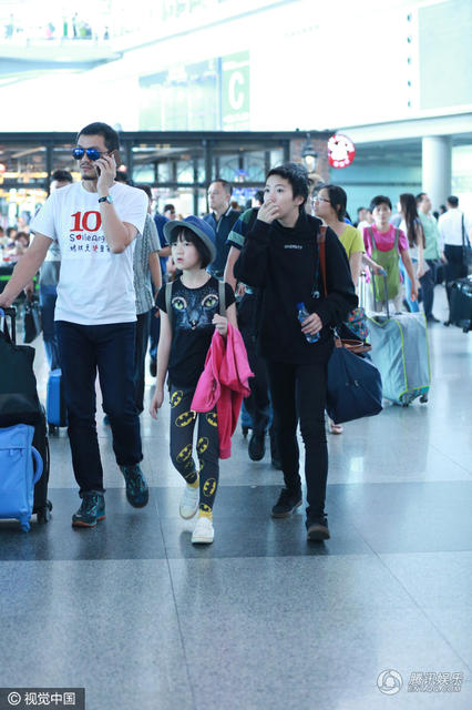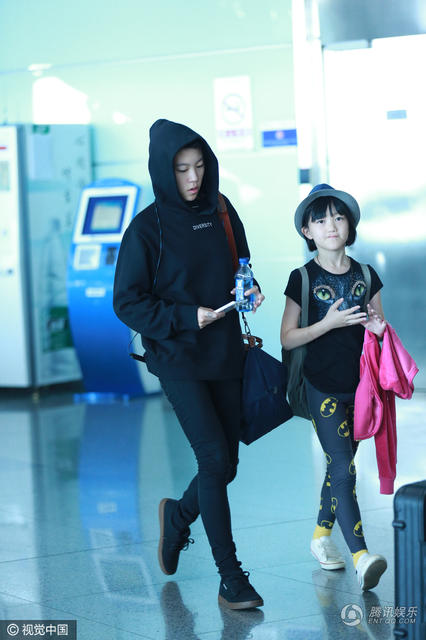 窦靖童走在妹妹的旁边,李亚鹏在后面。