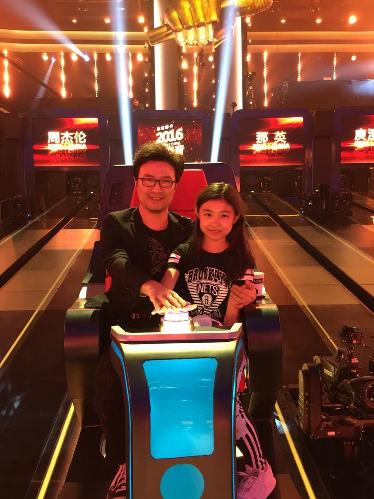在节目录制现场,汪峰带女儿观看节目录制。汪峰还特意让小苹果体验了一把“迪斯尼同款滑椅”——《中国新歌声》导师战车,体验“速度与激情”。战车上的汪峰满脸幸福,将小苹果揽在怀里,小苹果也满面笑容。