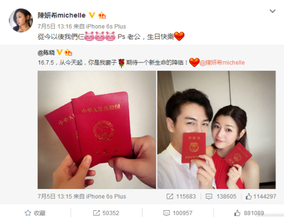 二陈的恋情在一片唱衰声中成长,坚定地幸福。两人在拍摄《神雕侠侣》时相识相恋,剧中过儿苦等姑姑16年无果,现实中两人从相恋到结婚却只用了16个月的时间,陈晓更是在其生日当天晒结婚证并且宣布爱妻怀孕,陈妍希一句简单的“我们仨”流露出浓浓的幸福感,热度不输去年冰晨恋的“我们”。