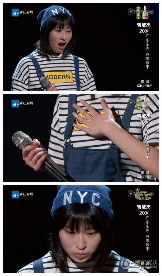 下面这位学员也来者不善。曾敏杰,一个自称有多动症的女孩儿,演唱《我是不是该安静的走开》,上台前先一系列动作稳定情绪。