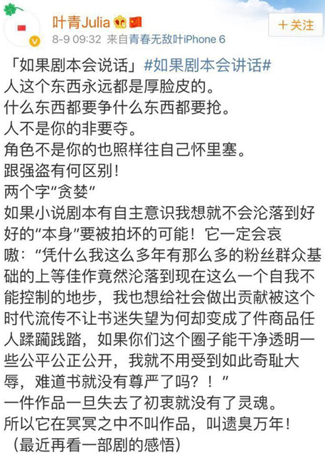 叶青用剧本的人称表达不满,她写道:“如果你们这个圈子能干净透明一些公平公正公开,我就不用受到如此奇耻大辱,难道书就没有尊严了吗?!一件作品一旦失去了初衷就没有了灵魂。所以它在冥冥之中不叫作品,叫遗臭万年!”叶青曾出演《步步惊心》中的宫女玉檀。