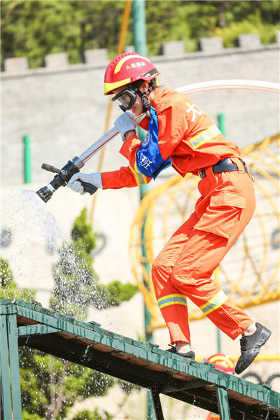 “百米梯次”游戏开始之后,奚梦瑶首当其冲和队长汪涵组成两条水枪队伍,站在最前面负责扛起水龙头向前冲刺,其他队友则负责护住水带,紧随其后前行。经过独木桥和带火的拱洞之后,汪涵和奚梦瑶两支水枪将冒着滚滚浓烟的火点扑灭。