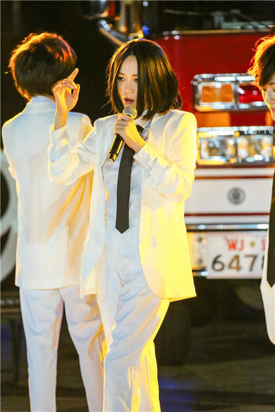 晚会上,女版F4空降舞台,陈乔恩、谢娜、江一燕和奚梦瑶身穿白色西装,装扮成十五年前F4的样子,帅气媲美当年。