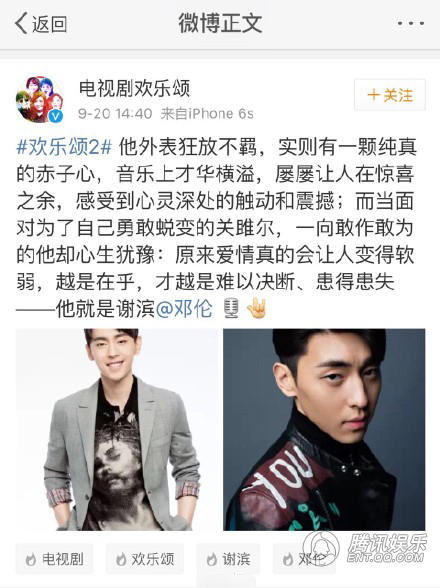 20日下午,《欢乐颂2》官方微博公布“谢滨”人选敲定当红偶像小生邓伦,在原著中,谢滨和关雎尔是一对儿,也就是说,我们的零感情经验的乖乖女关关要献出初恋啦~