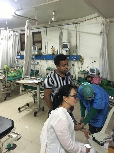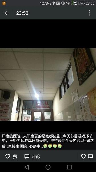 9月25日,著名女演员王姬在印度录制陕西卫视大型人文真人秀《丝路上有你》时意外受伤,据节目制作人透露,王姬伤势较为严重,节目录制已经暂停。图为:王姬就医。