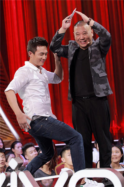 在全场的起哄声中,杜淳反客为主要求郭德纲当起人肉立柱,围着郭德纲跳起了一段钢管舞。