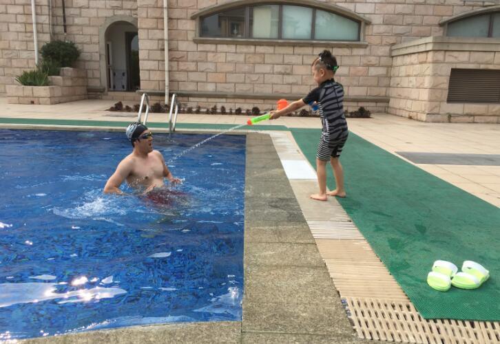 蔡轩正用水枪和爸爸玩耍。