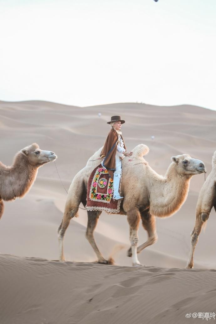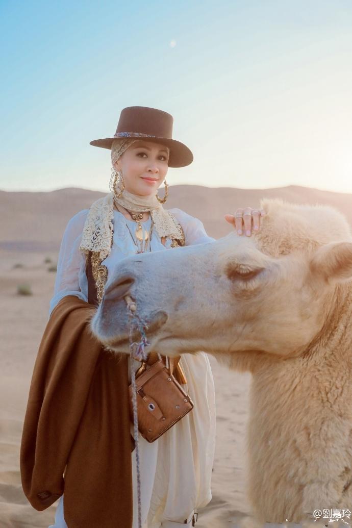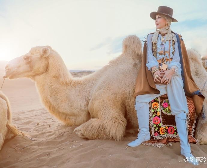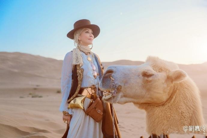 近日,刘嘉玲在自己的微博上曝一组自己录制《我们来了》的剧照,照片中刘嘉玲在茫茫沙漠中和骆驼“共舞”,衣服也充满异域风情,像极了影视剧中的波斯美女。网友看到后纷纷点赞,惊呼“女神”。图为刘嘉玲和骆驼合影。