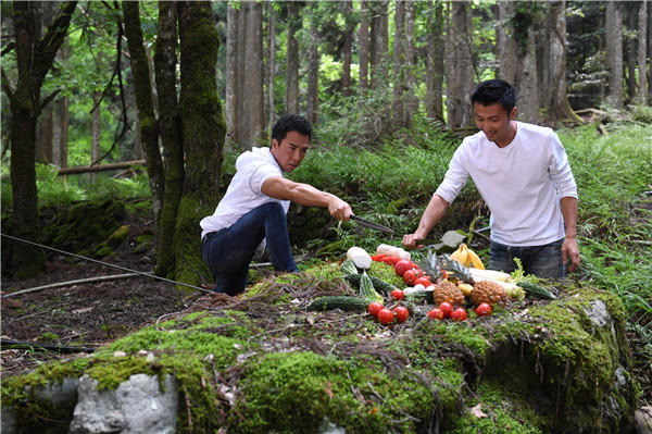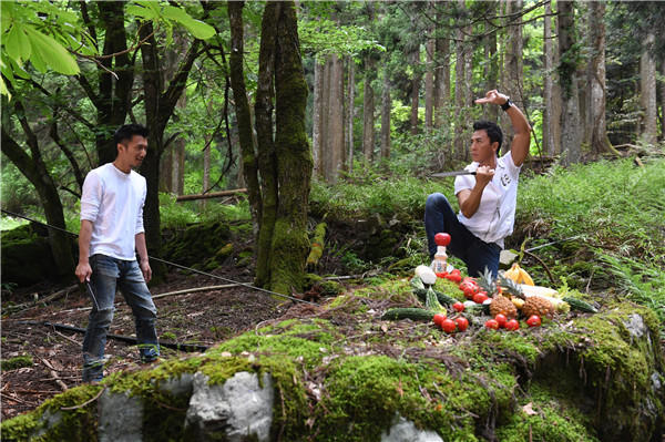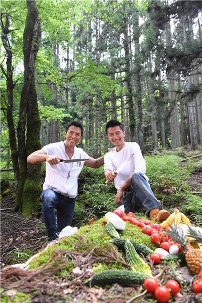 多年来深研厨艺,谢霆锋对切水果的感觉再了解不过了。只见他轻轻一抛水果,迅即挥刀斩去,水果立刻在空中一分为二可谓帅得行云流水。那么苦练功夫多年,还被谢霆锋称为“用兵器最帅的男人”的甄子丹呢?只见他波澜不惊地摆出了与谢霆锋同样的姿势动作。如此没有新意?然而,一阵刀光过后,被一分为二的居然是水果下方的饮料瓶,功夫大师之出招之诡异莫测瞬间让谢霆锋甘拜下风。图为两人深山切水果