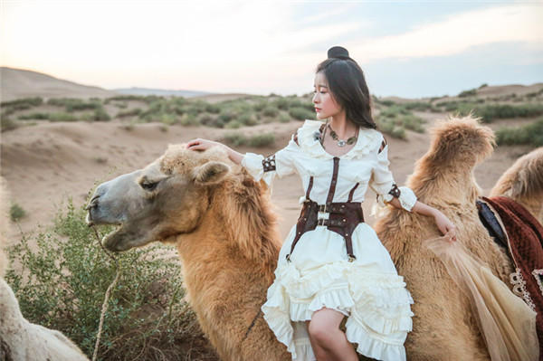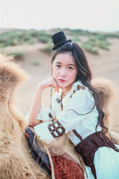 徐娇在沙漠中,结合了野外环境的严酷以一身白色的蒸汽朋克Lolita洋装,搭配上皮质腰带的和小礼帽发饰亮相,可爱中透着一股狂野的风格。