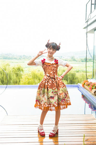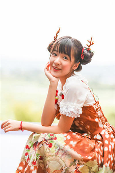 徐娇身穿Lolita洋装,头扎俏皮的丸子头,并搭配可爱的鹿角发饰。
