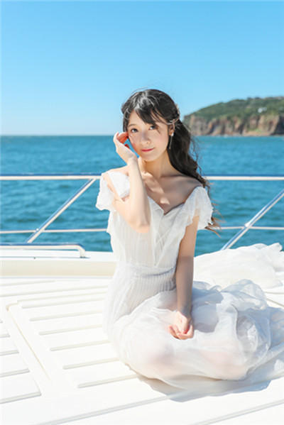 徐娇在大连站中,在豪华游艇上以一身白色蕾丝拖地长裙出场。