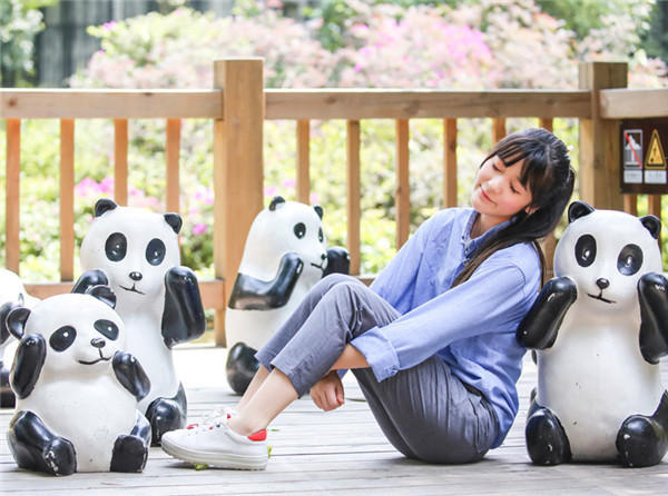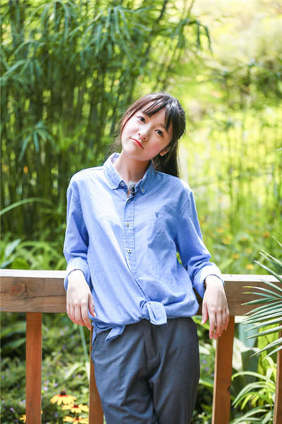 徐娇在喂大熊猫环节,换上一身干净利落的蓝色衬衫搭灰色休闲裤和小白鞋,在竹林中尽显清新气质。