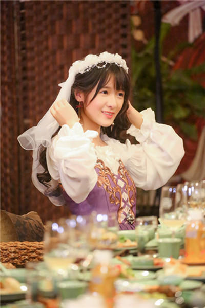 徐娇在最后一站新疆,以一身紫色系欧式芭蕾柄Lolita洋装,内搭一字肩泡泡袖衬衫和白色头纱亮相。