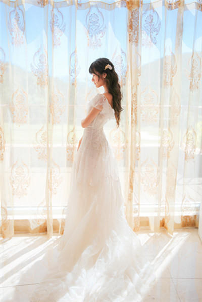 大V领小露香肩+美背镂空的拖地纱裙设计,搭配星月主题的珍珠耳链,徐娇一改往日的可爱萝莉风,仙气迷人。