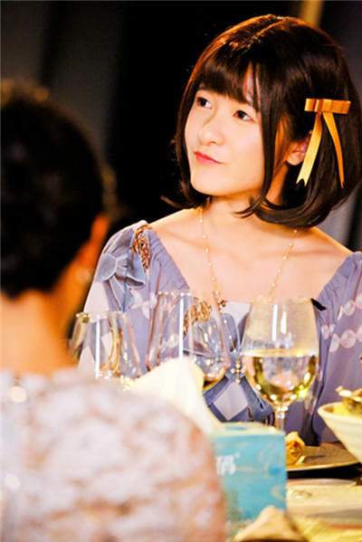 徐娇在晚宴时,换上紫色系蝴蝶结柄裙装,配上短假发及绸带发饰,可爱风十足。