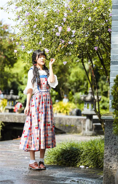 徐娇在腾冲古镇中,以一身樱桃刺绣背带裙+白色娃娃领衬衫和双马尾造型亮相。