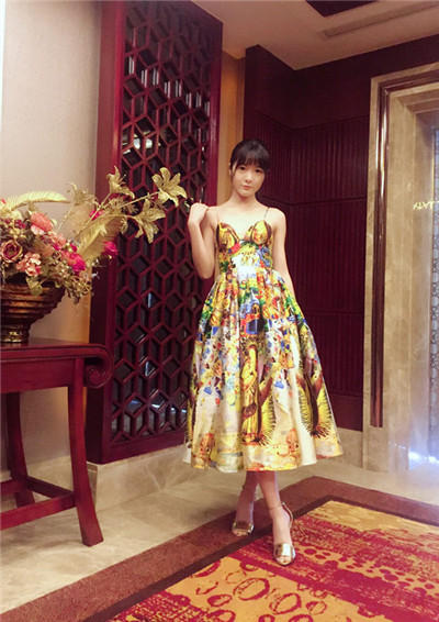 徐娇在生日会上,身穿某知名设计师的巴塞罗那城堡印花系列吊带裙,风格华丽却又不失优雅。