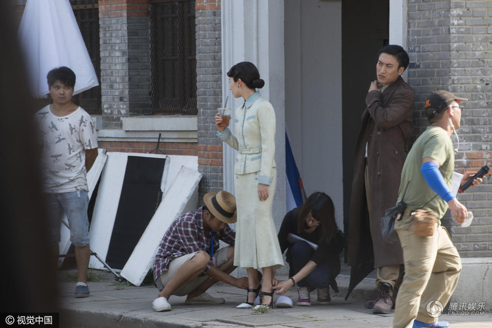 视觉中国讯 早前,电视剧《麻雀》片场,90后小花周冬雨身穿戏服悠闲地喝着饮料,任由两位工作人员蹲下为她穿鞋。