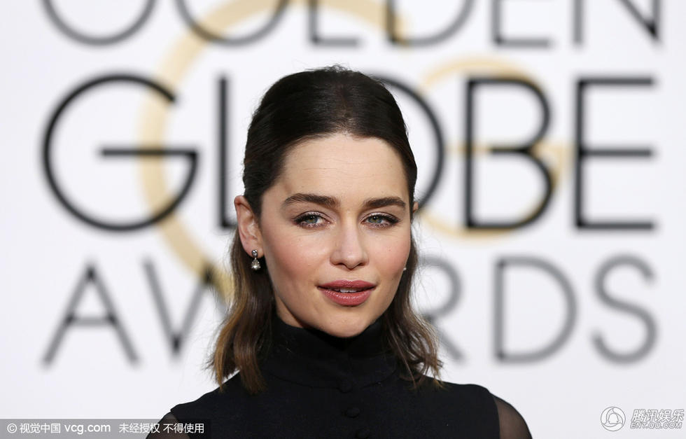 视觉中国讯 2016年1月11日,贝弗利山,当地时间1月10日,第73届美国电影电视金球奖颁奖典礼。《权利的游戏》“龙母”艾米莉亚·克拉克(Emilia Clarke)透视纱裙神秘亮相红毯。