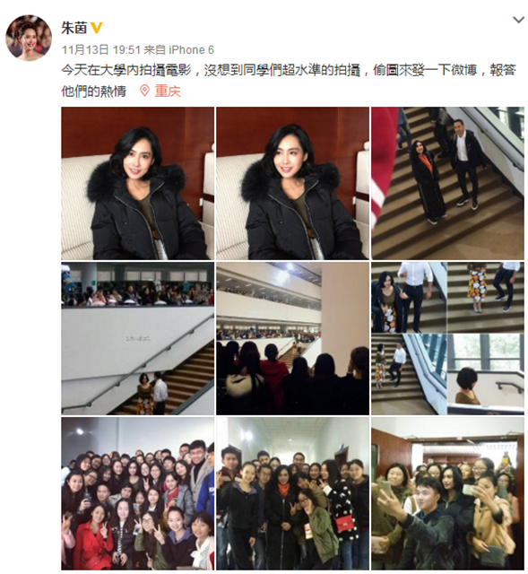 朱茵表示:“今天在大学内拍摄电影,没想到同学们超水平的拍摄,偷图来发一下微博,报答他们的热情。”