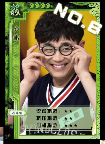 【NO.6大鹏】大鹏既是主持人又是演员还是导演,在节目里收放自如,无论什么问题都不会尴尬!冯小刚不是一个“合格”的导演,如果从头再来他一定会“娶”柳岩。虽然前面都对答如流,但是当被问到“范冰冰整没整容”的时候,他就胆怯不敢回答了,直接啃了一根辣椒。在玩狼人杀的时候,大鹏完全是发挥了演员的特长“扮猪吃老虎”,流泪表示自己是小白,这个心机Boy有点厉害哦。