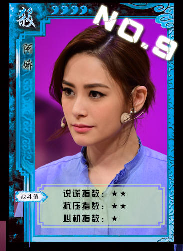 【NO.9阿娇】阿娇在回答问题时很干脆,像是“章子怡很丑”“我怀孕了”“和阿Sa关系最不好”这些问题都是脱口而出。但这也跟主持人的提问有很大的关系,因为问题本身没有存在很多陷阱,所以阿娇的说谎能力没有更多的体现。