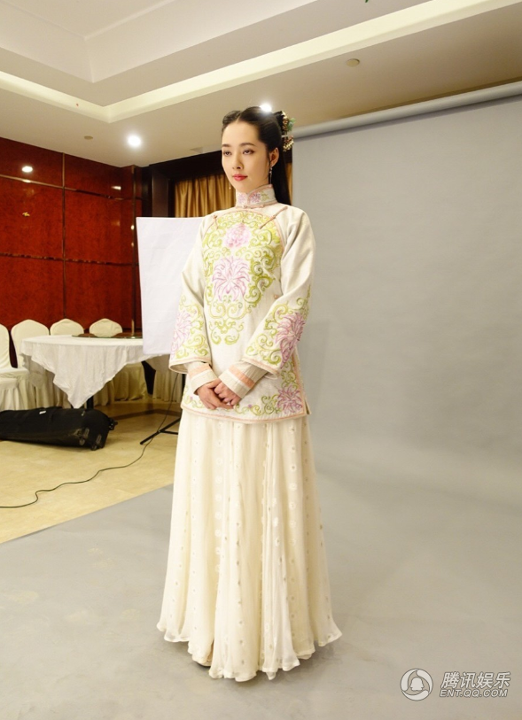 郭碧婷30日在微博贴出另一种古装照,穿着珠光白色的刺绣裙装,把头发往后梳,还利用了许多头饰做点缀。