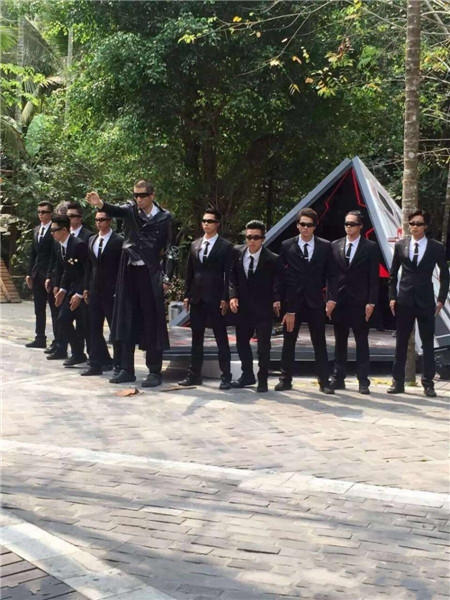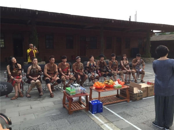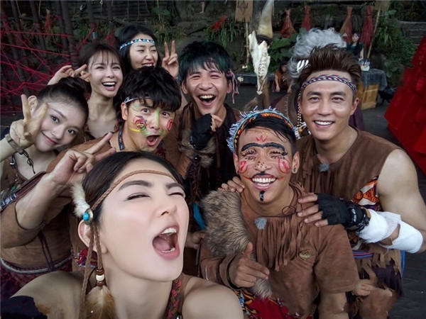 4月6日,《全员2》的录制中,嘉宾们集体cos野人,林允、刘雯、陈浩民等人均参与录制。图为全员加速的集体合影。