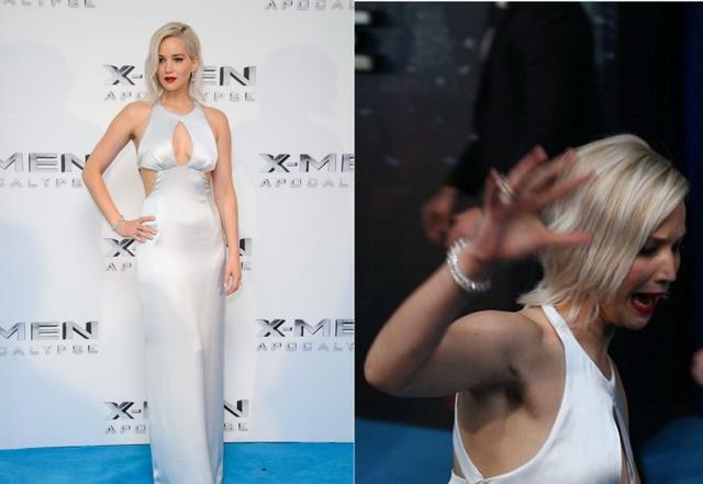 在此前詹妮弗劳伦斯在出席《X战警:天启》英国首映时,不慎差点摔倒