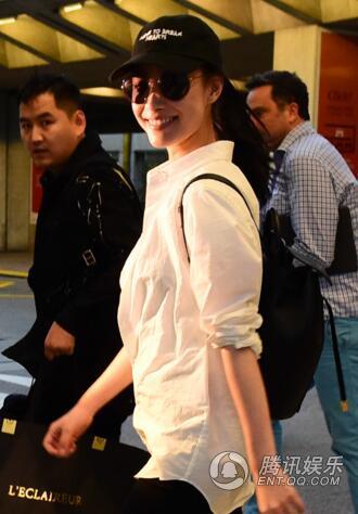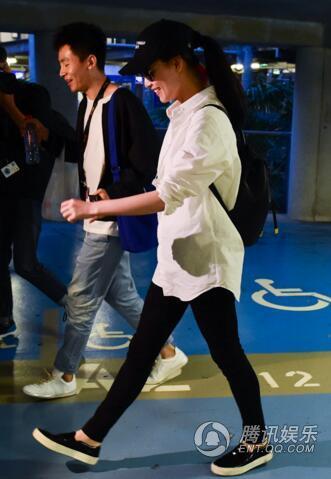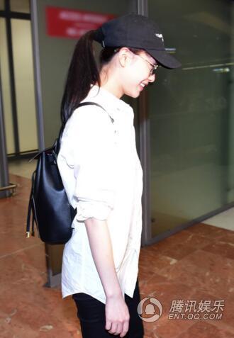 倪妮背着双肩包,一身简单的白衬衫,头戴黑色帽子,依旧一副活力少女范儿。