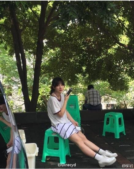 柳岩也在微博上晒照,片场她坐在凳子上休息。