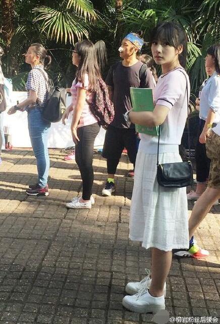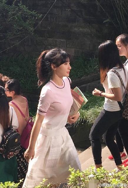 柳岩穿一身嫩粉色半袖,白色半身裙,扎马尾,青春靓丽。