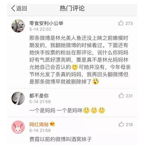 (文/番长)近日,一个名为“网红揭秘”的微博账号,曝光了一组“星女郎”林允在走红前的一张微博截图,当时微博号还叫“酒窝妹子”的她,晒出了一组自称是和“妈咪”的合影,还询问网友自己和“妈咪”是不是很像。