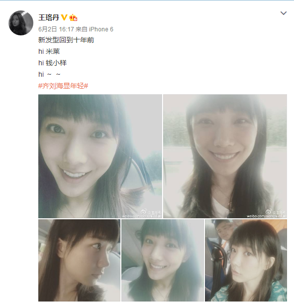 昨日(6月2日),王珞丹晒出一组照片,附文称“新发型回到十年前。hi,米莱。hi,钱小样。”