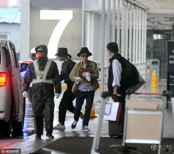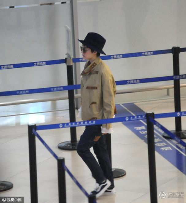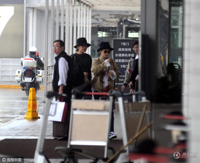 孙俪穿棕色外套,戴圆礼帽、圆框眼镜民国风十足,下车后抱包疾走,直奔安检区。