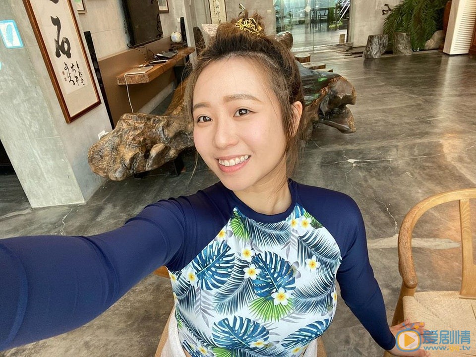 照片中,可以看到茵声随兴扎起头发,身穿拼接印花图案的蓝色上衣,一手抓着玩偶放在肩膀上,一手掌镜由上往下自拍,关掉美肌功能后,肤色明显有落差,其余与用上美肌的模样并无差异。