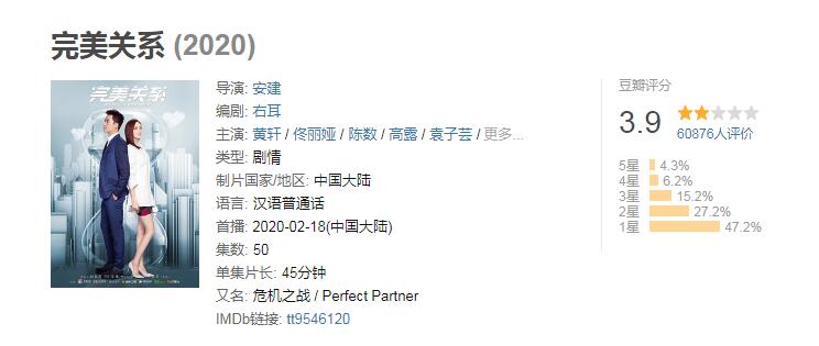 都是由安建导演的,情节相似性也比较高,但这两部剧播出后口碑很差。安考试及格得了6.2分,广播量达到38亿,而“完美关系”并不令人满意。豆瓣只得了3.9分,比考试及格还差。除了不合理的情节设计,男女主角的表演也受到观众的批评。