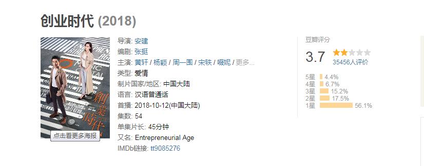 。2018年,由安建执导的《创业时代》也名声不佳。豆瓣的得分低了3.7分。男主角也是黄轩,女主角是杨颖。剧中男主角和女主角的表现更为关键。《完美关系》和《创业时代》中女主角的突出表现是造成低分数的主要因素。要说谁应该为这样一个坏名声承担责任,我认为除了编剧和演员的演技,导演也应该承担一些责任。毕竟,每一个镜头都不能越过障碍,导演决定最后的锤子,对吗?