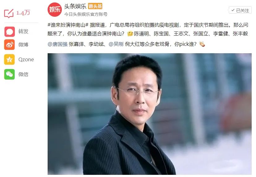 [防疫电视剧开始准备,谁将出演钟南山?据媒体报道,最近成为最受欢迎的编剧的