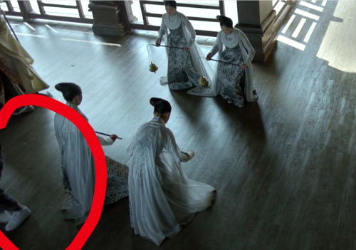 这是“庆余年”穿孔镜头。一群穿着白色衣服的女士在过道里向路过的主人鞠躬,但是观众的注意力仍然被镜头左下角的一双白色运动鞋和他们穿着牛仔裤的腿吸引住了。既然照相机是开着的,为什么工作人员不能远离镜头?这种偷懒也是粗心造成的。