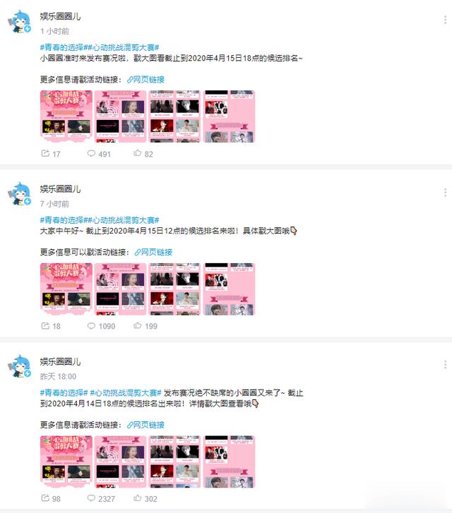 今天,b站娱乐区的官方账号每天都在发布“心脏挑战混合剪切大赛”的实时排名,供大家监督,但b站的官方博客下仍然没有相关事件的微博。